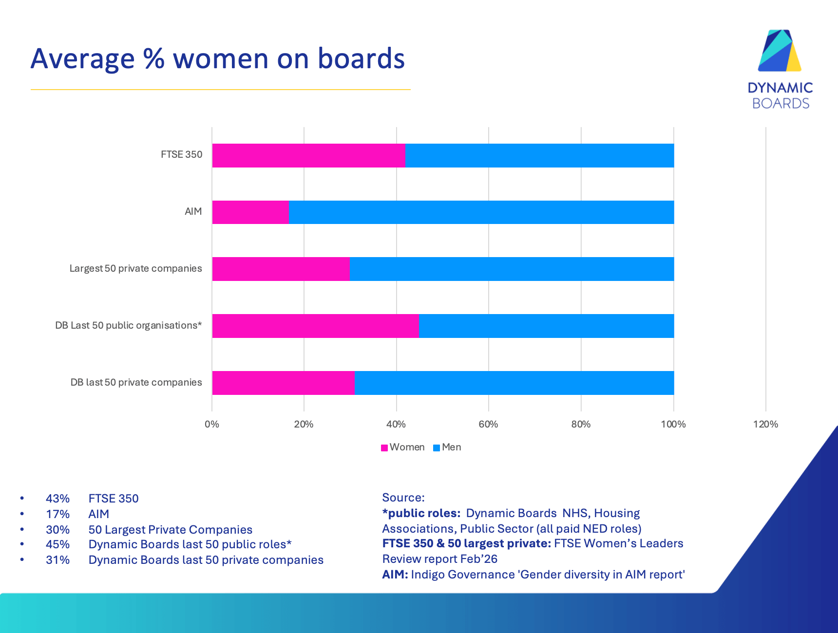• Dynamic Boards last 50 private companies – 31% women • Dynamic Boards last 50 public organisations – 45% women • Largest 50 private companies – 30% women • FTSE 350 – 42% women • AIM – 16.8% women